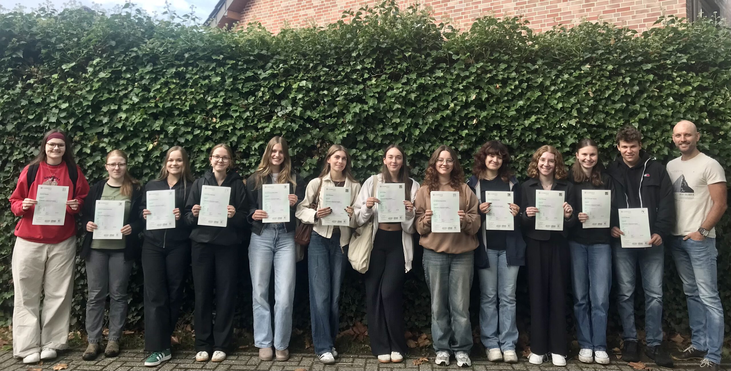 Der große Aufwand hat sich gelohnt: Die Schülerinnen und Schüler erhielten jetzt ihre Zertifikate. Auf dem Bild (v.l.): Josefine Stamm, Johanna Frauenholz, Vanessa Klimczok, Frida Nieländer, Hannah Mohr, Merle Berghaus, Jill Turnbull, Lisa Kappenberg, Iustina Bucovina, Linda Temmler, Maria Triptrap, Hendrik Martens, Lehrer Fabian Merkes. Es fehlen Paula Humbeil, Ani Iashvili, Ava Schug, Baris Kök und Bernadett Kovacs.