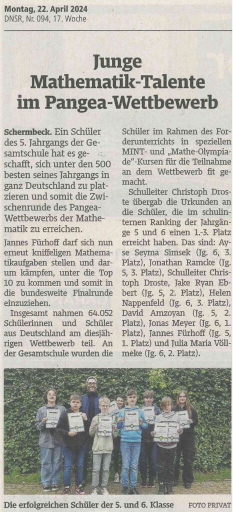 Die Teilnahme am Pangea-Wettbewerb unterstreicht das Engagement der Gesamtschule Schermbeck für die Förderung mathematischer Talente und zeigt, dass Mathematik mehr ist als nur Zahlen und Formeln – sie ist ein faszinierendes und herausforderndes Abenteuer, das die Schülerinnen und Schüler begeistert und inspiriert.