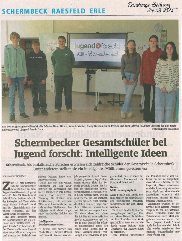 Am 14. Februar haben sich 5 Schülerinnen und Schüler der Gesamtschule Schermbeck gemeinsam mit ihren Lehrerinnen Frau Herbstritt und Frau Sadowski auf den Weg nach Marl gemacht, um am Regionalwettbewerb „Jugend forscht“ teilzunehmen.