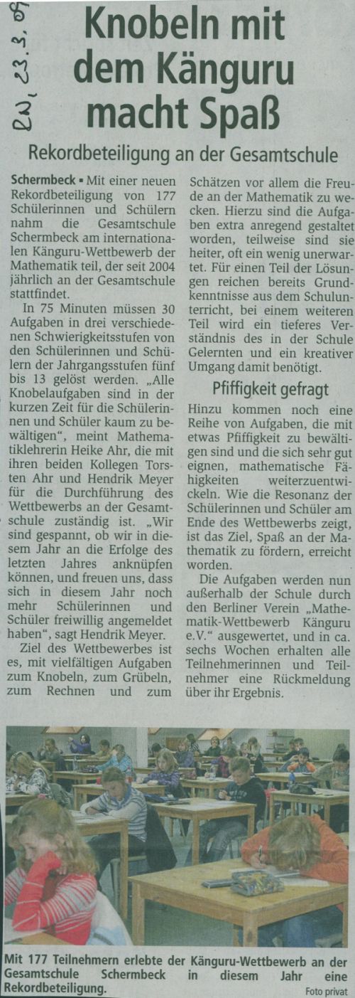 Die Gesamtschule Schermbeck ist die weiterführende Schule für Schermbeck und genießt großes Vertrauen bei Eltern und Schülerinnen und Schülern aus Schermbeck und den umliegenden Kommunen. Die Schülerinnen und Schüler aus Dorsten, Raesfeld, Kirchhellen, Marienthal usw. haben bei der Anmeldung dieselben Chancen zur Aufnahme wie diejenigen aus Schermbeck. Immer wieder auftretende Gerüchte, die etwas anderes behaupten, sind einfach falsch.