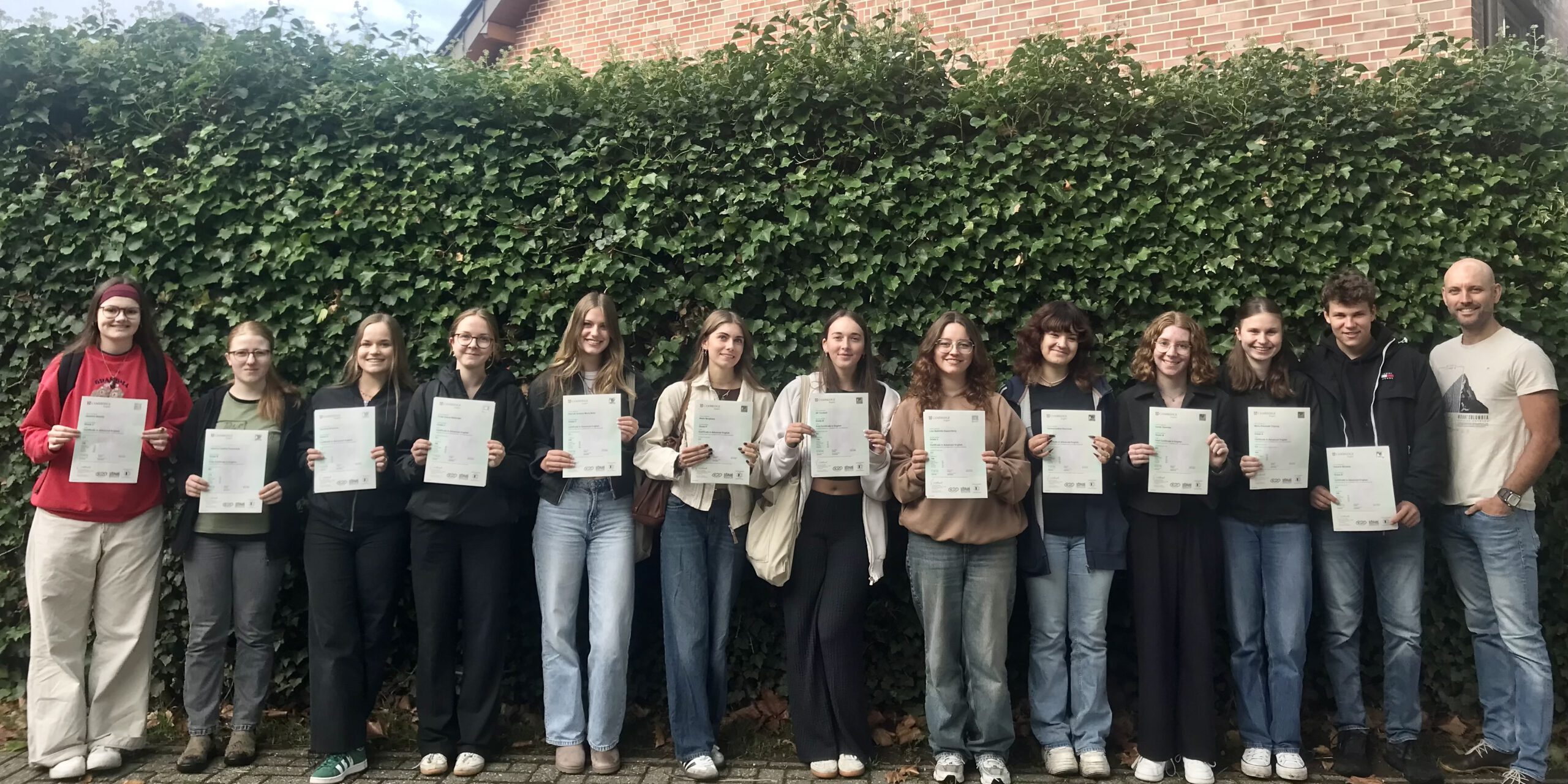 Der große Aufwand hat sich gelohnt: Die Schülerinnen und Schüler erhielten jetzt ihre Zertifikate. Auf dem Bild (v.l.): Josefine Stamm, Johanna Frauenholz, Vanessa Klimczok, Frida Nieländer, Hannah Mohr, Merle Berghaus, Jill Turnbull, Lisa Kappenberg, Iustina Bucovina, Linda Temmler, Maria Triptrap, Hendrik Martens, Lehrer Fabian Merkes. Es fehlen Paula Humbeil, Ani Iashvili, Ava Schug, Baris Kök und Bernadett Kovacs.