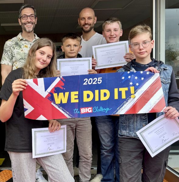 Die Teilnehmer und Teilnehmerinnen konnten die Fragen zu Wortschatz, Grammatik, Aussprache und Landeskunde mit ihren iPads bearbeiten. Viele Schülerinnen und Schüler lagen mit ihren Ergebnissen über dem deutschlandweiten Durchschnitt. Das Bild zeigt die Jahrgangssieger Linus Timm (Kl. 5), Leon Schulte (Kl. 6), Wenke Hülsmann (Kl. 7) sowie Oleksii Krasnyi (Kl.8). Wir gratulieren zu der tollen Leistung!
