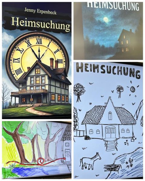 Schülerergebnisse des Deutsch-LKs: Gestaltung eines Buchcovers zur Lektüre „Heimsuchung“ von Jenny Erpenbeck