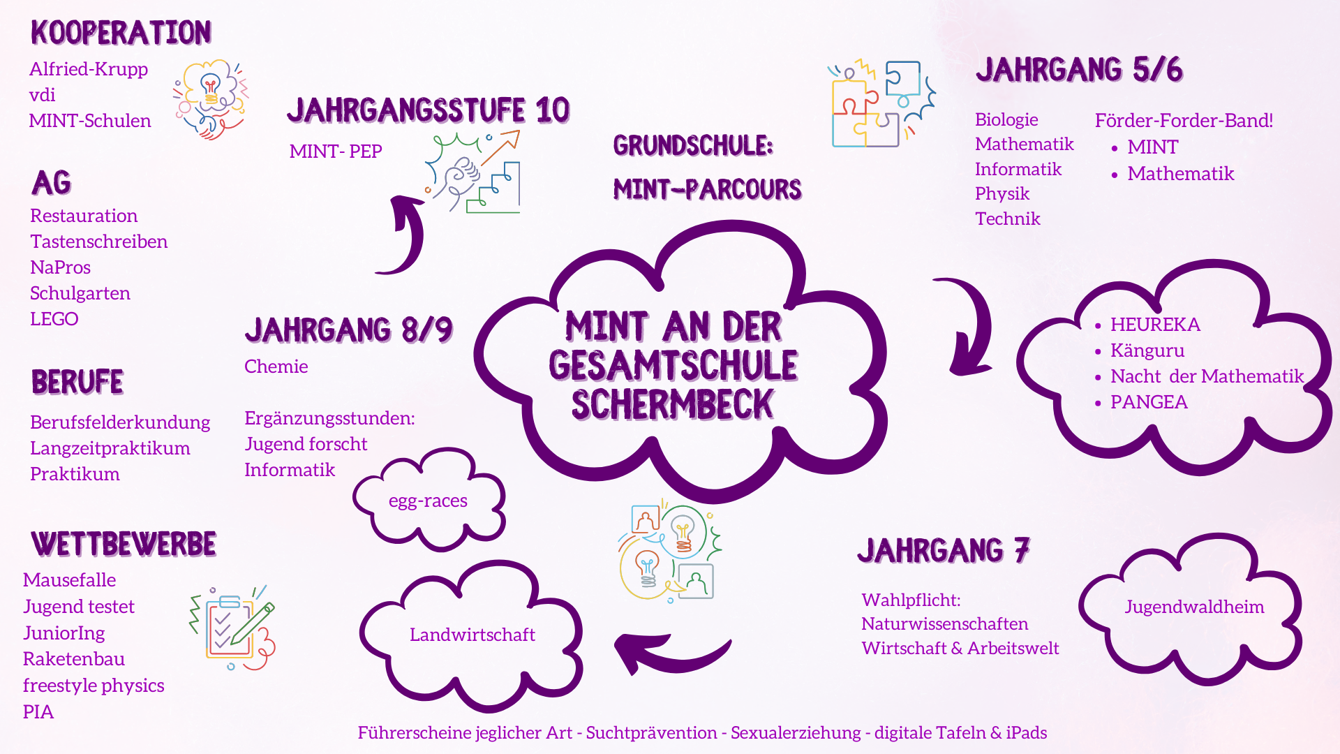 Die Übersicht veranschaulicht anschaulich, wie breit unser MINT-Bereich aufgestellt ist: von Unterrichtsschwerpunkten über Arbeitsgemeinschaften, Jugend forscht, den Wahlphlicht / Ergänzungsstunden, dem MINT-Forderkurs und Wettbewerben bis hin zu außerschulischen Kooperationen.