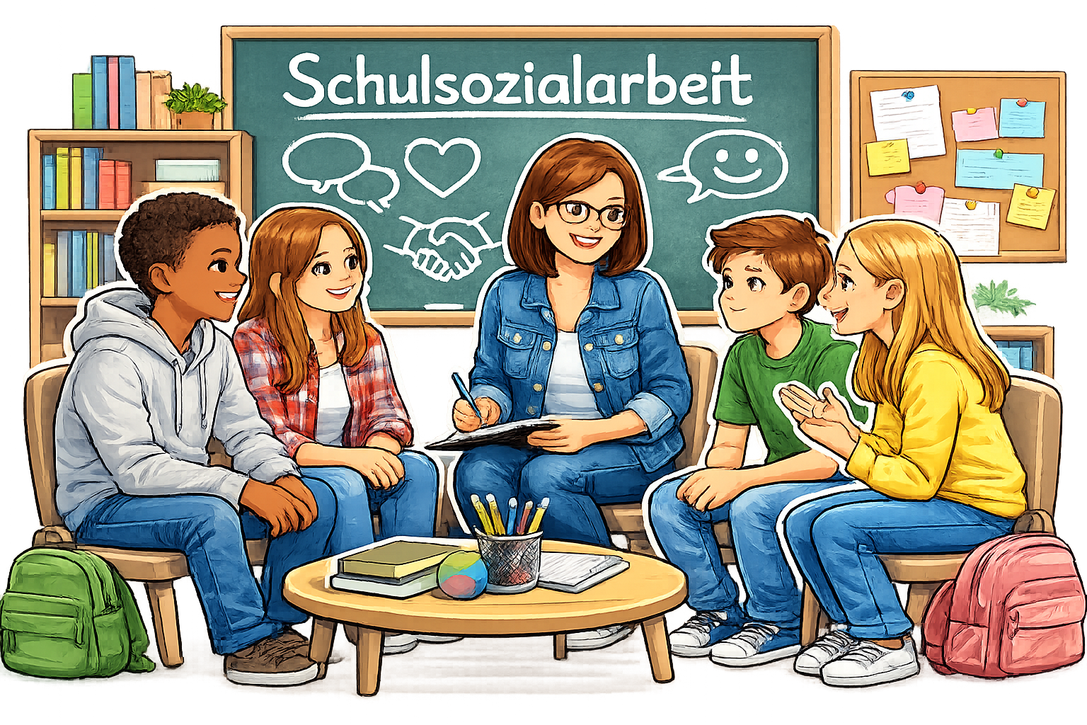 Das Ziel der Schulsozialarbeit ist es, Schülerinnen und Schüler sowie Eltern in verschiedenen Lebenslagen zu unterstützen und zu begleiten. Besonders im Fokus steht dabei die psychosoziale Beratung, mit der wir gemeinsam Lösungen finden, um das Wohlbefinden aller zu fördern.