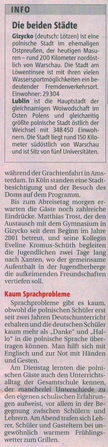Die Partnerschaft zum Gymnasium in Gizycko besteht seit dem Jahre 2001