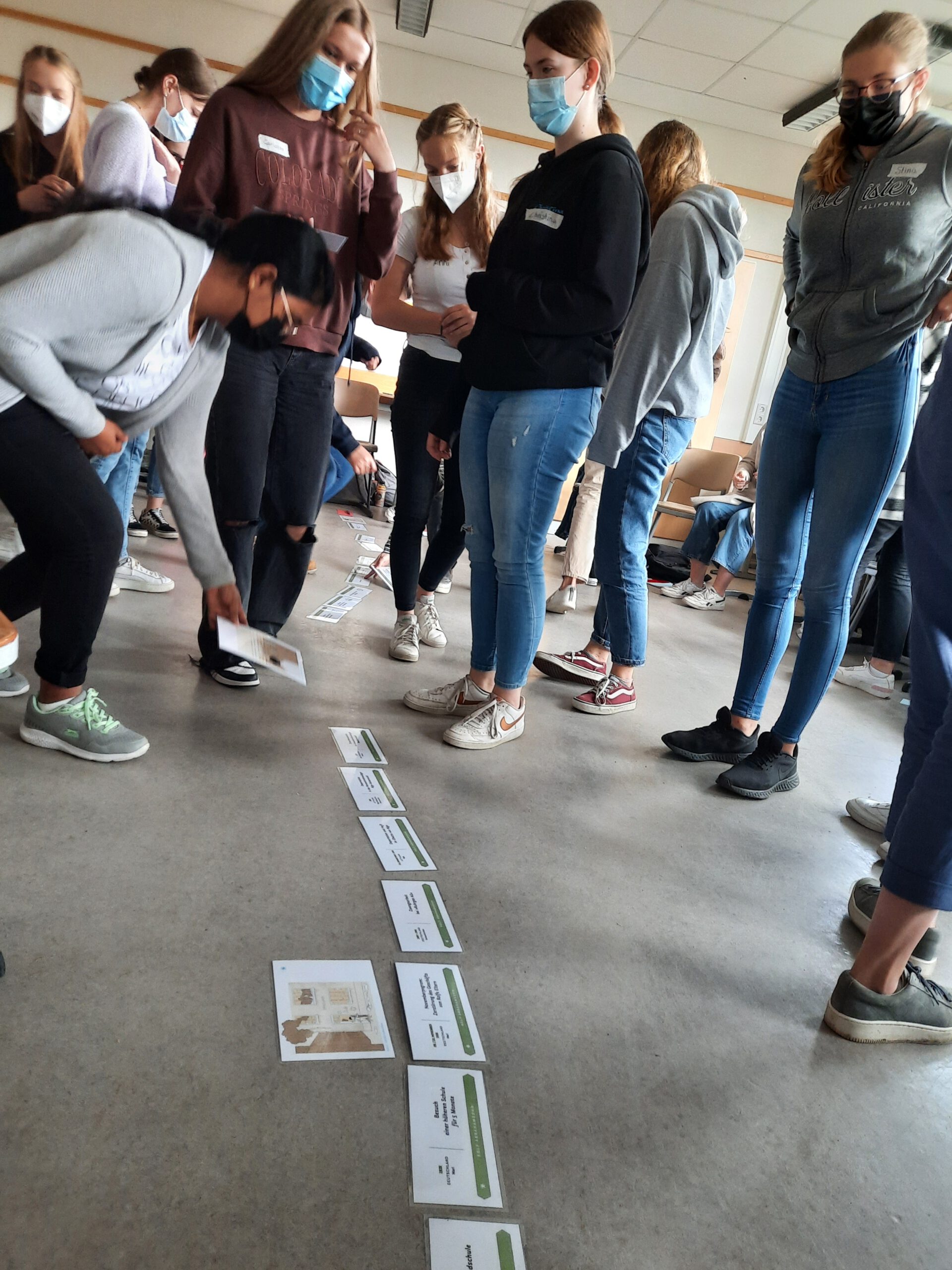 Nachmittags präsentierten wir die verschiedenen Geschichten der Zeutzeug*innen unserem Jahrgang, damit auch unsere Mitschüler*innen zu Zweitzeug*innen wurden und Geschichten weiterzählen können. Denn wir waren uns alle einig, dass der Holocaust niemals in Vergessenheit geraten darf und uns alle immer wieder daran erinnern muss, wozu Diskriminierung und Rassismus im schlimmsten Fall führen kann. Wir, als eine Gesellschaft, haben die Verantwortung, für ein offenes und tolerantes Deutschland einzustehen, in dem sich Jede*r, unabhängig von Herkunft, Glauben, Sexualität etc. sicher und willkommen fühlen kann.