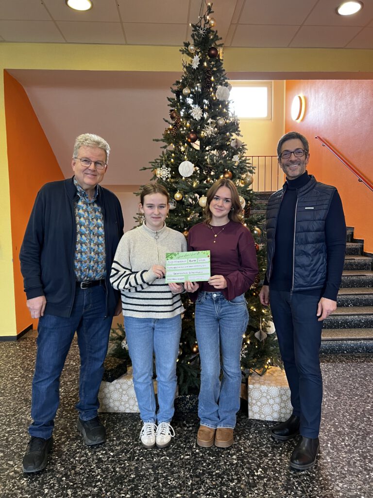 Heute durfte unser Schulleiter, Herr Droste, einen Scheck in Höhe von 505,97 Euro für den Förderverein entgegennehmen – überreicht von zwei Schülerinnen (Marion und Guilina) aus einer unserer 10. Klassen aus dem Abgangsjahrgang 2024/ 2025 und ihrem ehemaligen Klassenlehrer, Herrn Klem.